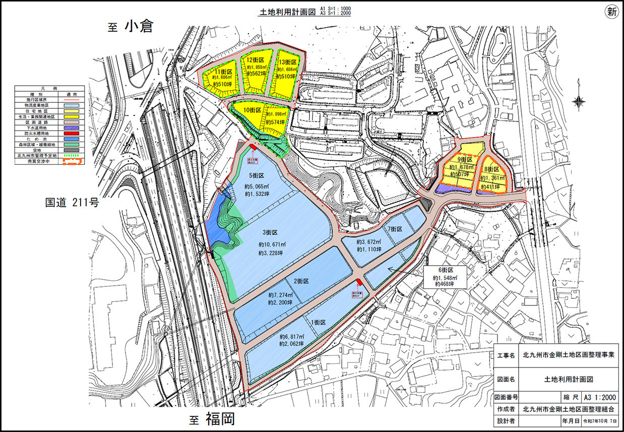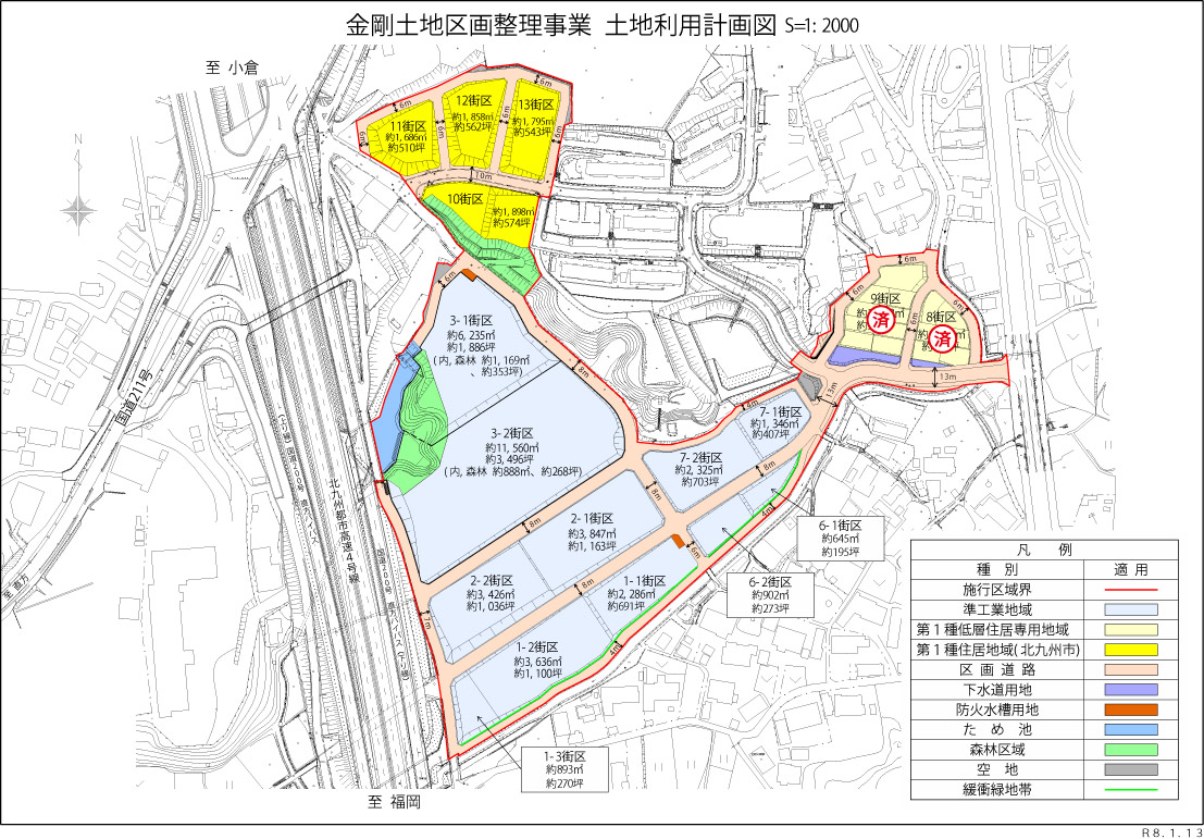 北九州市金剛土地区画整理事業の組合設立認可の公告日(令和6年3月6日)から換地処分の公告日までの間に、土地区画整理事業が施行されている区域内で建築行為等を行う場合は、土地区画整理法第76条第1項の規定により、市長の許可を受ける必要があります。